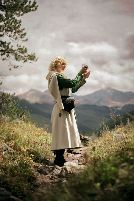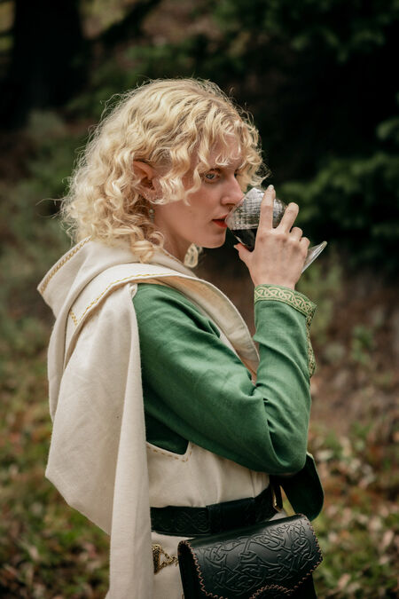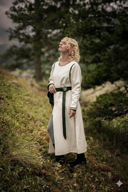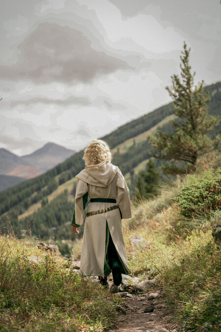 This one is not just a regular surcoat. It is made of superb quality Italian wool, soft and flowy, and has removable sleeves. You can wear those just as regular sleeves or keep them hanging from your shoulders like wings when you want your arms free and unrestricted. Pretty much like our Middle Ages tunic “Hollow Hills,” it features front and back riding slits that also make running and walking more comfortable. The garment is decorated with contrast golden stitching along the central and arm slits. It has a deep neckline to make it more comfortable as an outer layer worn over something else.