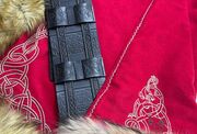 Kaftans were a popular item in dark ages clothing, usually used in combination with or in place of a cloak to keep the wearer warm. We have taken slight creative liberty with this piece, intending to create something that may not have existed, but COULD have existed in some stretch of the imagination. Our kaftan has a flattering cut and flows excellently when you walk, creating a handsome silhouette. To make this a truly luxurious kaftan, we’ve included some knot-work embroidery from the centre of the coat up to the buckles. The embroidery is quite neutral and is not meant to resemble any particular animal or pattern, and would go well with any of our other viking items.